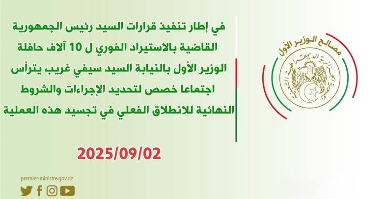 ترأس الوزير الأول بالنيابة، سيفي غريب، اليوم، بقصر الحكومة، اجتماعا خصص لتحديد الإجراءات والشروط النهائية للانطلاق الفعلي في تجسيد عملية ،الاستيراد الفوري ل10 آلاف حافلة جديدة لنقل المسافرين لتعويض القديمة.