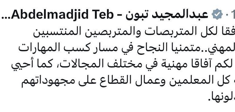 وتمنى رئيس الجمهورية في حسابه الشخصي: “دخولا موفقا لكل المتربصات والمتربصين المنتسبين للتكوين المهني .. متمنيا النجاح في مسار كسب المهارات التي تفتح لكم آفاقا مهنية في مختلف المجالات، كما أحيي بالمناسبة كل المعلمين وعمال القطاع على مجهوداتهم التي سيبذلونها.