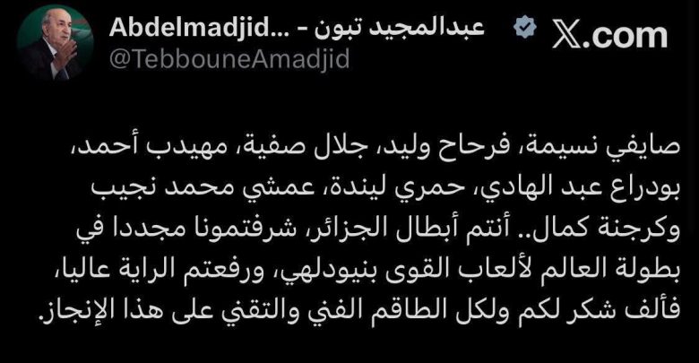 هنأ رئيس الجمهورية عبد المجيد تبون ، اليوم، أبطال الجزائر، في بطولة العالم لألعاب القوى بنيودلهي على حسابه الشخصي.
