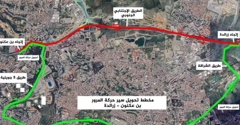 و سيتم تحويل حركة السير بالنسبة للقادمين من زرالدة إلى الدار البيضاء إلى “محول الطريق الوطني رقم 36، ثم إلى الطريق الوطني رقم 41 مرورا بالشراقة وشوفالي، ثم الخروج عبر الطريق السريع 5 جويلية إلى الطريق الاجتنابي الجنوبي”، وفق نفس البيان.