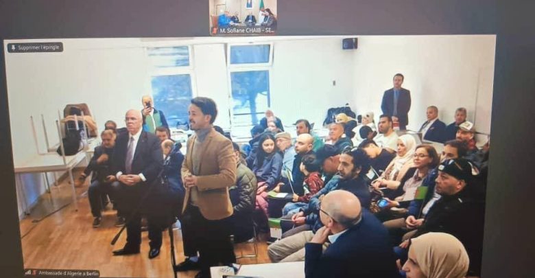 نظمت مداومة القنصلية المتنقلة لمصالح سفارة الجزائر ببرلين، بحضور سفير الجزائر بألمانيا لقاء افتراضي، جمع كاتب الدولة لدى وزير الشؤون الخارجية المكلف بالجالية الوطنية بالخارج ، سفيان شايب، بالجالية هناك