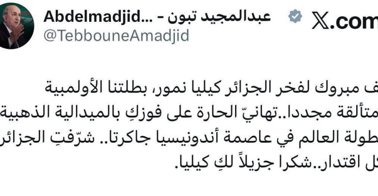 وعبر الرئيس بفخر “ألف مبروك لفخر الجزائر كيليا نمور، بطلتنا الأولمبية المتألقة مجدداً