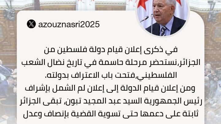 نشر عزوز ناصري، رئيس مجلس الأمة، عبر حسابه الخاص على منصة X، تغريدة بمناسبة الذكرى الـ 37 لإعلان قيام دولة فلسطين من الجزائر، مؤكدا ثبات الدولة الجزائرية على مبادئها.