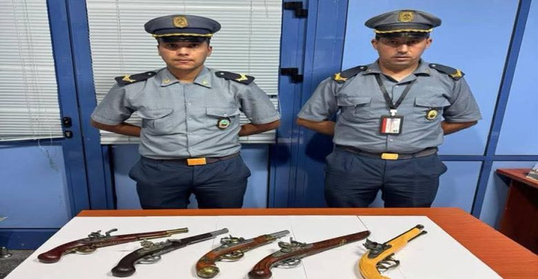 المسدسات عثر عليها مخبأة داخل الأمتعة الشخصية لأحد المسافرين، وذلك أثناء معالجة رحلة جوية قادمة من مدينة ليل الفرنسية وفق بيان الجمارك .