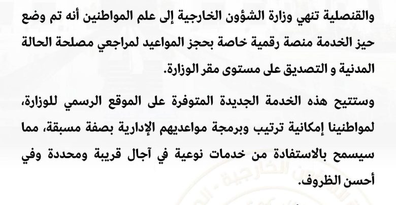 منصة رقمية لحجز مواعيد بمصلحة الحالة المدنية والتصديق بوزارة الشؤون الخارجية