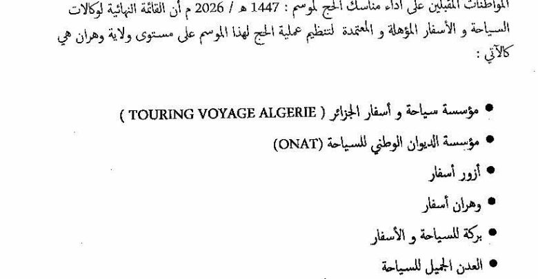ودعت مديرية السياحة المقبلين على أداء مناسك الحج الموسم : 1447 هـ / 2026 م أن القائمة النهائية لوكالات السياحة و الأسفار المؤهلة و المعتمدة لتنظيم عملية الحج لهذا الموسم على مستوى ولاية وهران هي كالآتي :