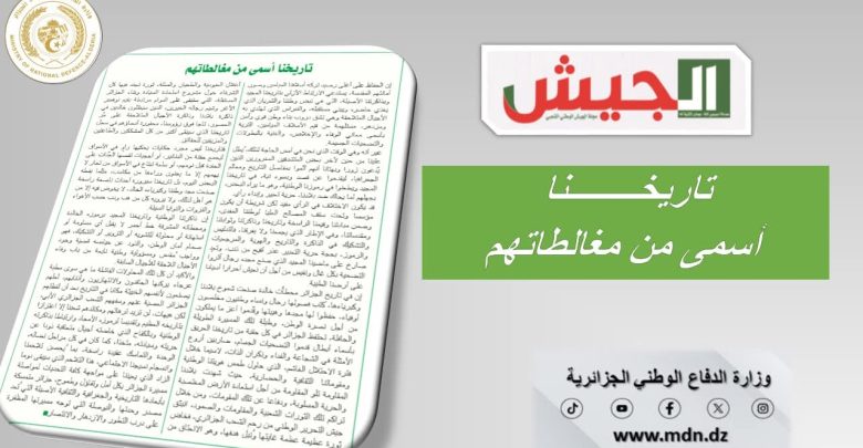 ونبهت مجلة الجيش تحت هذا العنوان للتاريخ ، بالمحاولات الفاشلة والتي ما هي سوى مطية عرجاء يركبها الحاقدون والانتهازيون وأذنابهم، مشيدة بارتباط الشعب الجزائري، بتاريخ الأمجاد وارتباطه بذاكرته الوطنية وبالكفاح الذي خاضته أجيال متعاقبة ذودا عن حريته وسيادته، متخذا، كما كان في كل مراحل نضاله، الوحدة والتماسك عقيدة راسخة، بما يُحصن تلاحمنا وانسجام نسيجنا الاجتماعي.