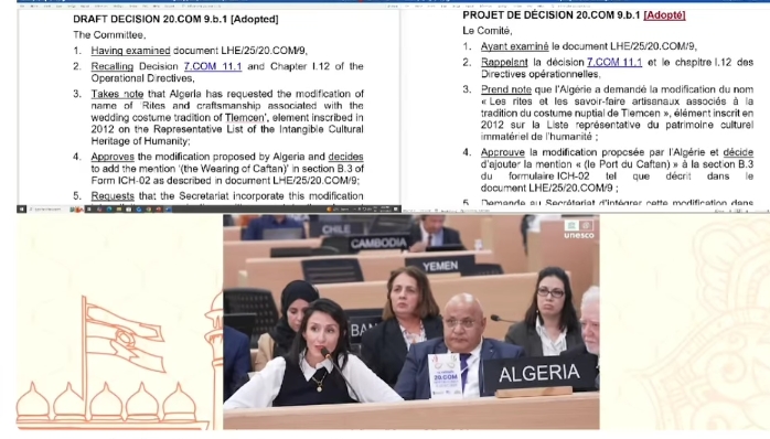 أقرت اليوم، الدورة العشرون للجنة الحكومية الدولية لصون التراث الثقافي اللامادي لمنظمة اليونسكو، الملتئمة بالعاصمة الهندية نيودلهي، يوم ، بطريقة جلية وصريحة أسبقية الجزائر في تسجيل القفطان كمكون أساسي في تراثها الثقافي الغني.