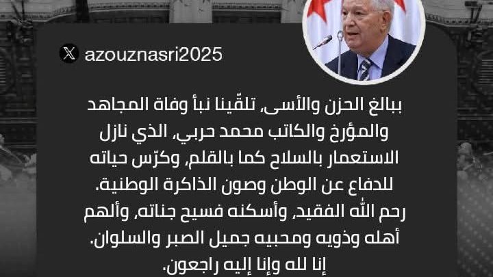 ونقل عبر حسابه على منصة X: “ببالغ الحزن والأسى، تلقّينا نبأ وفاة المجاهد والمؤرخ والكاتب محمد حربي، الذي نازل الاستعمار بالسلاح كما بالقلم، وكرّس حياته للدفاع عن الوطن وصون الذاكرة الوطنية.