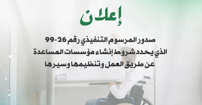 صدر المرسوم التنفيذي رقم26-99 مؤرخ في 12 شعبان عام 1447 الموافق 31 جانفي 2026، يحدد شروط إنشاء مؤسسات المساعدة عن طريق العمل وتنظيمها وسيرها، والذي يهدف إلى ترقية العمل المحمي للأشخاص ذوي الاحتياجات الخاصة الذين لديهم قدرات محدودة لا تسمح لهم بممارسة نشاط مهني في وسط العمل العادي، وذلك عبر مؤسسات المساعدة عن طريق العمل من أجل تشجيع ادماجهم واندماجهم الاجتماعي.