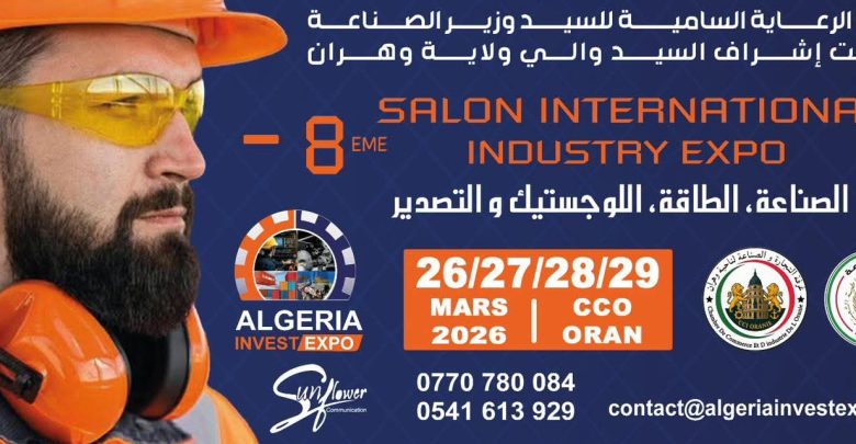 تنطلق بوهران، فعاليات الطبعة الثامنة للصالون الدولي للصناعة – Algeria Invest Exp، و الصالون الإفريقي للبناء، البنى التحتية والتكنولوجيات الحديثة – Africa Build Expo، ابتداء من هذا من 26 إلى 29 مارس الجاري بقصر المؤتمرات أحمد بن أحمد.