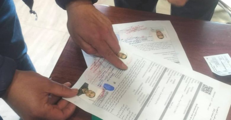 ويتعين أن يتم البصم بالسبابة اليسرى بالخبر الأزرق و بالكمية الكافية ، وتؤخذ البصمة كاملة و واضحة .