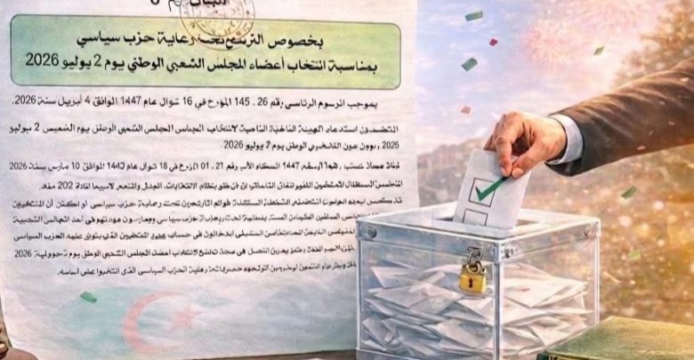 وللمزيد من التوضيح بخصوص الترشح تحت رعاية حزب سياسي بمناسبة انتخاب أعضاء المجلس الشعبي الوطني يوم 2 يوليو 2026 :” بموجب المرسوم الرئاسي رقم 26 – 145 المؤرخ في 16 شوال عام 1447 الموافق 4 أبريل سنة 2026 المتضمن استدعاء الهيئة الناخبة لانتخاب أعضاء المجلس الشعبي الوطني يوم الخميس 2 يوليو 2026، وعملا بأحكام الأمر رقم 21 – 01 المؤرخ في 26 رجب عام 1442 الموافق 10 مارس سنة 2021 المتضمن القانون العضوي المتعلق بنظام الانتخابات المعدل والمتمم لاسيما المادة 202 منه