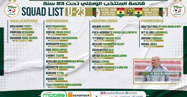وجه مدرب المنتخب الوطني لكرة القدم لأقل من 23 سنة، نور الدين ولد علي، الدعوة لـ26 لاعبا تحسبا للمواجهة المزدوجة ضد غانا (24- 28 مارس)، لحساب الدور الثالث والأخير من تصفيات كأس إفريقيا للأمم 2023.