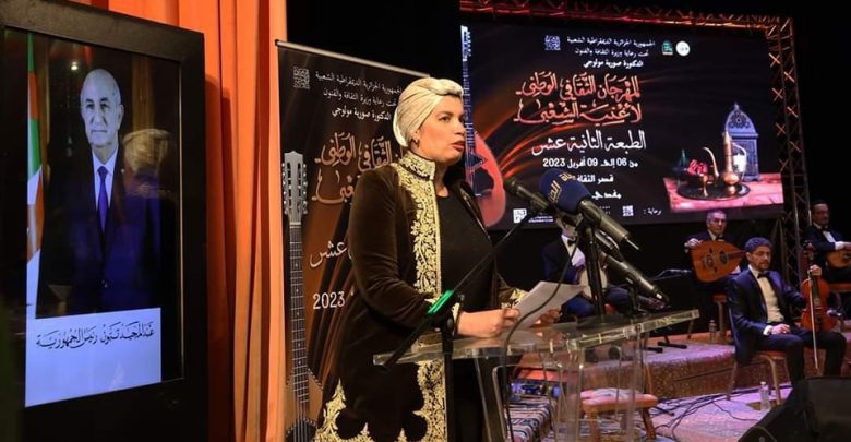 وأفادت وزيرة الثقافة والفنون لدى تناولها الكلمة للإعلان الرسمي عن إفتتاح الطبعة الثانية عشر من المهرجان الثقافي الوطني لأغنية الشعبي، أن هذه التظاهرة ستفتح أفقاً رحباً لكل مبدعي ومحبي وعشاق موسيقى وأغنية الشعبي، مع فتح المجال أكثر لكل المواهب والأصوات الواعدة لتكون في واجهة الأغنية الجزائرية الشعبية، هذا اللون الموسيقي الذي تعلق الجزائريون به مخلصين ومحبين فأبدعوا له الروائع منذ عقود من الزمن، ولا يزال خير الخلف سائرا على درب الكبار إلى يوم الناس هذا.