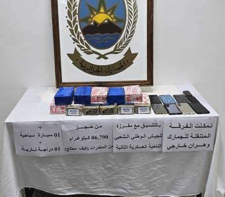 أقدمت الجمارك بوهران في سياق المهام الميدانية المتواصلة للفرق العملياتية و بالتنسيق مع مفرزة للجيش الوطني الشعبي، من حجز 06,790كيلوغرام من المخدرات (كيف معالج) إثر تفتيش سيارة.