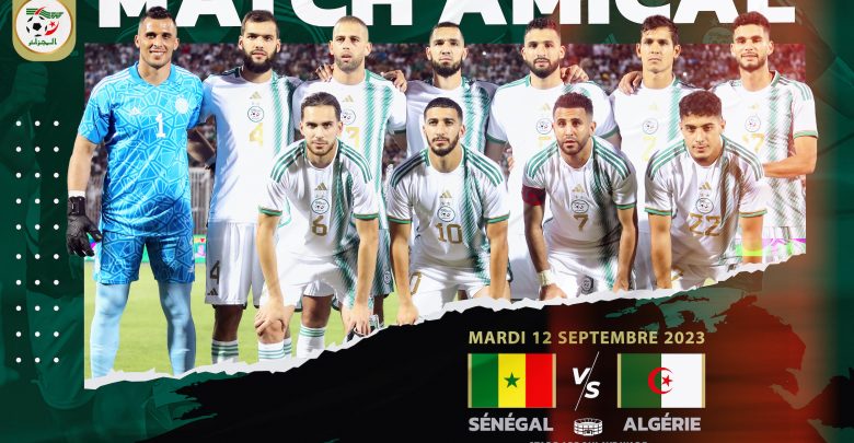 يجري المنتخب الوطني الجزائري لكرة القدم، مقابلة ودية أمام نظيره السنغالي (حامل اللقب الافريقي) يوم 12 سبتمبر المقبل بملعب عبدولاي واد بداكار بداية من الساعة 19:00 بتوقيت غرينيتش 20:00 بتوقيت الجزائر.