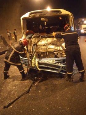 خلف حادث اصطدام حافلة بشاحنة دات مقطورة وقع على مستوى الطريق السيار شرق غرب داخل نفق زيغود يوسف في اتجاه قسنطينة، 16 جريح من كلا الجنسين تتراوح أعمارهم بين 03 و 48 سنة لهم اصابات خفيفة .