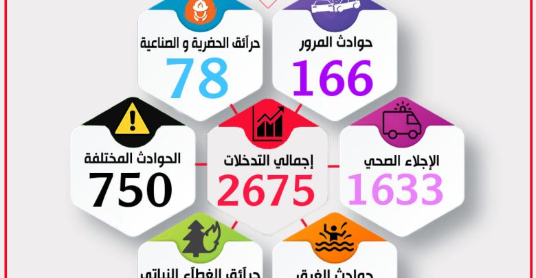 وسجلت الحصيلة على المستوى الوطني، مع معاينة 166 حادث مرور، و11 حريق للغطاء الغابي، و78 حرائق حضرية، وصناعية من مجموع التدخلات 2675 .