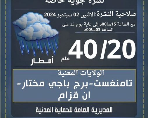تستمر حالة تقلب الطقس وتساقط أمطار رعدية معتبرة محليا على الولايات الشرقية والجنوبية للوطن اليوم الإثنين.