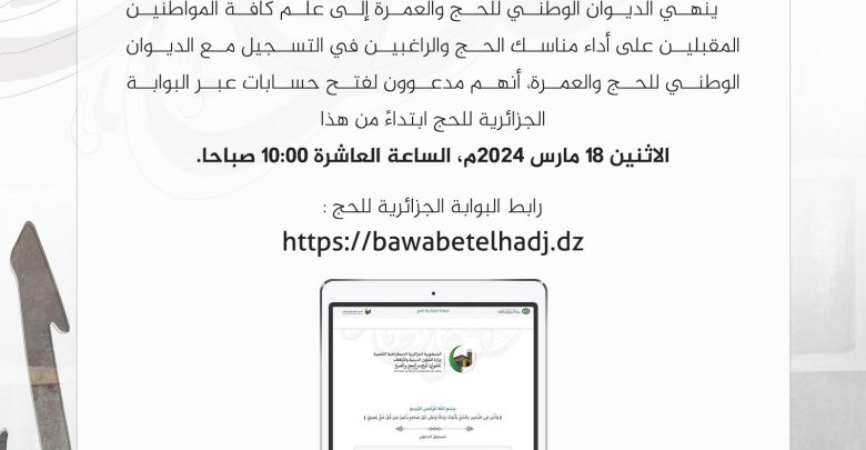 أعلن الديوان الوطني للحج والعمرة ، عن تمكين كافة المواطنين المقبلين على أداء مناسك الحج لموسم 2024/1445 والراغبين في التسجيل معه، أنهم مدعوون لفتح حسابات عبر البوابة الجزائرية للحج يوم غد الاثنين ابتداء من الساعة 00ر10 صباحا عبر الرابط HTTPS://bawabtelhadj.dz