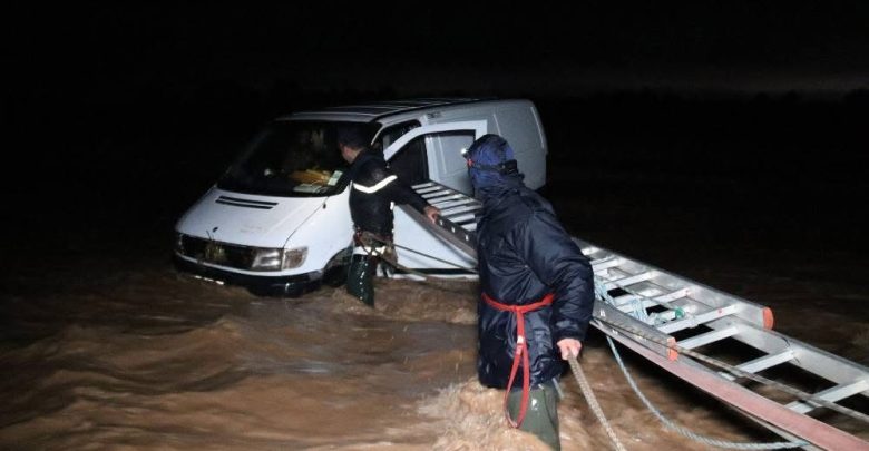 كما تم إنقاذ شخصين كانوا على متن سيارة عالقة بسبب إرتفاع منسوب مياه واد بالمكان المسمى حي بنات بلكحل.