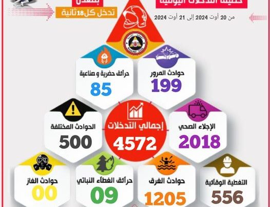 سجلت الحماي المدنية خلال 24 ساعة الأخيرة إجمالي التدخلات 4572 تدخل بمعدل تدخل كل 18 ثانية