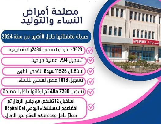 وعاينت ذات المصلحة إجراء 11526فحص طبي لسيدات توافدن على المصلحة للكشف الصحي عن مختلف الامراض النسائية، كما تم تسجيل 1616 فحص نفسي. كما سجلت المصلحة خلال السنة الماضية 5175عملية ولادة منها 3523 عملية ولادة طبيعية و1648 عملية ولادة قيصرية، في حين تم تسجيل 794 جراحة بالمنظار وعمليات استئصال الأورام الحميدة أو الخبيثة من داخل الرحم. وفي ذات السياق تم تسجيل 7288 حالة تم ابقائها داخل المصلحة من اجل تلقي العلاج اللازم، وتم استقبال 212شخص من جنس الرجال تم اخضاعهم للاستشفاء اليومي (Hôpital De Jour) داخل وحدة علاج العقم لدى الرجال. مع العلم تبقى المجهودات الطبية متواصلة للفريق الطبي بداخل المصلحة لتقديم كافة الخدمات الصحية اللازمة للتكفل بالمرضى المتوافدين وفق بيان خلية الاعلام بمستشفى إيسطو۔