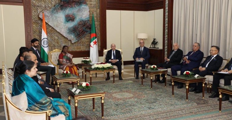 وقال رئيس الجمهورية في تصريح صحفي مشترك مع رئيسة جمهورية الهند, دروبادي مورمو, عقب المحادثات التي جمعت بينهما بمقر رئاسة الجمهورية: “أرحب مجددا برئيسة دولة الهند الصديقة التي تقوم بزيارة دولة الى الجزائر ولأول مرة تستقبل الجزائر رئيسا للهند، حيث سبق وأن استقبلنا الوزراء الأولين”, مبرزا أنه تم خلال هذه الزيارة إجراء “محادثات مكثفة تناولنا خلالها التعاون الثنائي وآفاق تطويره من جهة وتطرقنا من جهة أخرى الى قضايا إقليمية ودولية راهنة”.