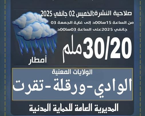 تقلبات حالة الطقس تشمل اليوم الخميس على الساعة 15:00 زوالا وإلى غاية يوم غد الجمعة على الساعة 03:00 صباحا.ولايات تقرت، ورقلة وجنوب الوادي.