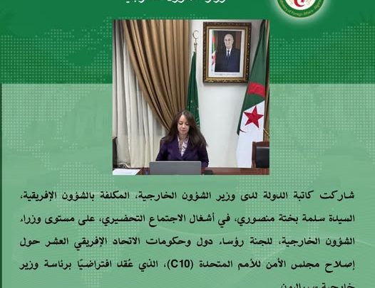 مثلت كاتبة الدولة لدى وزير الشؤون الخارجية، المكلفة بالشؤون الإفريقية، سلمة بختة منصوري، الجزائر، في أشغال الاجتماع التحضيري، على مستوى وزراء الشؤون الخارجية، للجنة رؤساء دول وحكومات الاتحاد الإفريقي العشر حول إصلاح مجلس الأم للأمم المتحدة (C10)، الذي عُقد افتراضيًا برئاسة وزير خارجية سيراليون.