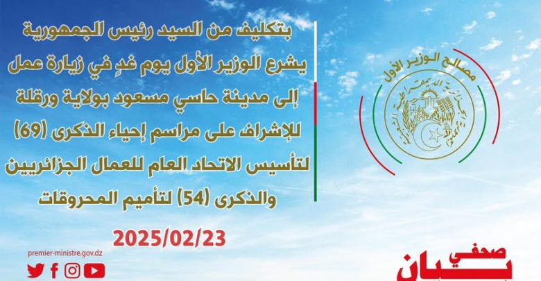 و شرع الوزير الأول نذير العرباوي، بتكليف من رئيس الجمهورية السيد عبد المجيد تبون، في زيارة عمل لمدينة حاسي مسعود بولاية ورقلة، للإشراف على مراسم إحياء الذكرى المزدوجة ال69 لتأسيس الاتحاد العام للعمال الجزائريين و ال54 لتأميم المحروقات.