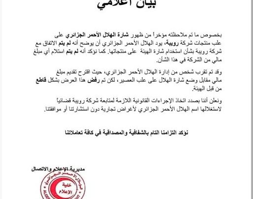 جاء في بيان الهلال الأحمر:” بخصوص ما تم ملاحظته مؤخراً من ظهور شارة الهلال الأحمر الجزائري على علب منتجات شركة ، يود الهلال الأحمر الجزائري أن يوضح أنه لم يتم الاتفاق مع شركة رويبة بشأن استخدام شارة الهيئة على منتجاتها. كما نؤكد أنه لم يتم استلام أي مبلغ مالي من الشركة في هذا الشأن.