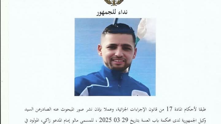 ” طبقا لأحكام المادة 17 من قانون الإجراءات الجزائية، وعملا بإذن نشر صور المبحوث عنه الصادر عن السيد وكيل الجمهورية لدى محكمة باب العسة بتاريخ 20250329 ، للمسمى مالو إمام المدعو زاكي، المولود في 1988/06/05 بمغنية ابن محمد وتدماية جميلة الساكن بقرية السلام بلدية باب العسة، وتبعا للتحقيق المفتوحمن طرف مصلحة البحث والتحري للدرك الوطني بتلمسان المتعلق بالحصول على معلومات عن المبحوث عنه المذكور أعلاه، بجناية الشروع في القتل العمدي بواسطة سلاح ناري مسدس آلي) في هذا الصدد توجه مصالح الدرك الوطني بتلمسان نداء لكل من لديه معلومات حول المبحوث عنه المتواجد في حالة فرار، أو أي شخص شاهده أو تعرف عليه التقرب من مصلحة البحث والتحري للدرك الوطني بتلمسان للدرك الوطني و الأمن الوطني.”