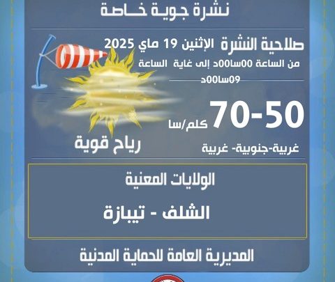 نبهت اليوم الإثنين ، نشرية للديوان الوطني للأرصاد الجوية، بتشكل رعود و هبوب رياح قوية بالعديد من الولايات.