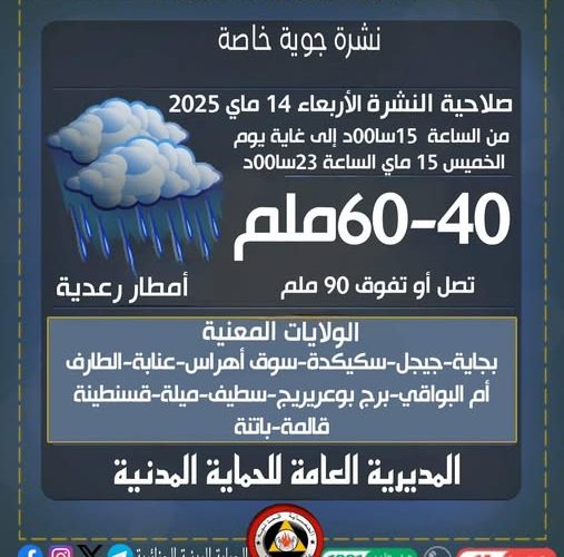 أكمل القراءة »ب إيمان نبهت نشرية لمصالح الديوان الوطني للأرصاد الجوية ، تبقى صالحة لغاية يوم الغد الخميس ، بتساقط أمطار غزيرة،…