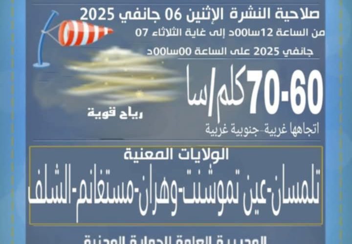 أكمل القراءة »ق.إلياس أفادت النشرية الجوية الخاصة الصادرة عن الديوان الوطني للأرصاد الجوية، بهبوب رياح قوية غربية-جنوبية غربية تصل سرعتها من 60…