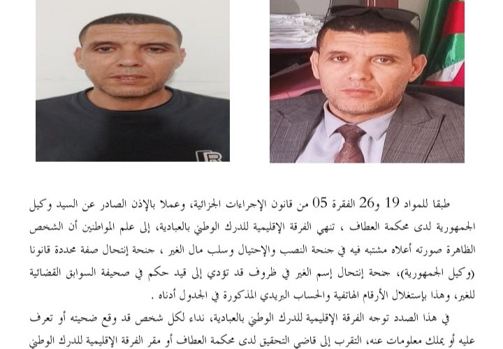 أكمل القراءة »ق.إلياس وجهت الفرقة الإقليمية للدرك الوطني بالعبادية، نداء للجمهور، عن شخص مشتبه فيه في جنحة النصب والإحتيال وسلب…