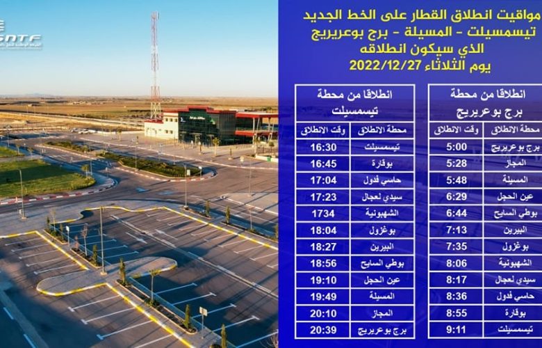 أكمل القراءة »يدخل القطار عبر خط النقل بالسكة الحديدية الجديد: تيسمسيلت – المسيلة – برج بوعريريج حيز الخدمة هذا الثلاثاء 27 ديسمبر…