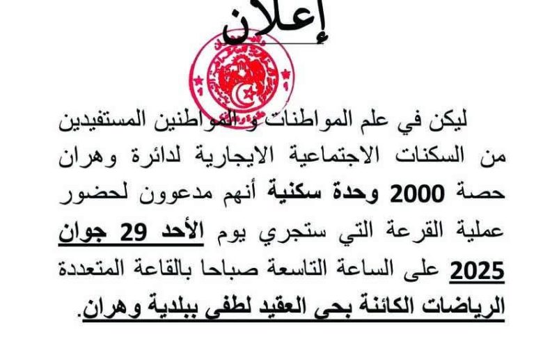 أكمل القراءة »ق.إلياس تقرر إجراء عملية القرعة الخاصة بالمستفيدين من حصة 2000 مسكن إجتماعي بالتنقيط ببلدية وهران هذا الأحد، بالقاعة المتعددة الرياضات…
