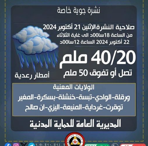 ق۔إلياس أوضحت نشرية الجوية الصادرة عن الديوان الوطني للأرصاد الجوية بتهاطل أمطار رعدية . كمية الأمطار المتوقعة بين 40/20ملم ،…