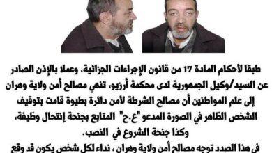 وجهت شرطة وهران، اليوم الثلاثاء نداء للجمهور، حول توقيف نصاب المدعو “ح،ع” منتحل وظيفة، ومحترف النصب على المواطنين. ودعت الشرطة…
