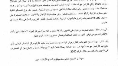 سونالغاز وهران تتخذ تدابير استثنائية لضمان نوعية واستمرارية خدمة توزيع الطاقة الكهربائية طيلة فترة الامتحانات المدرسية