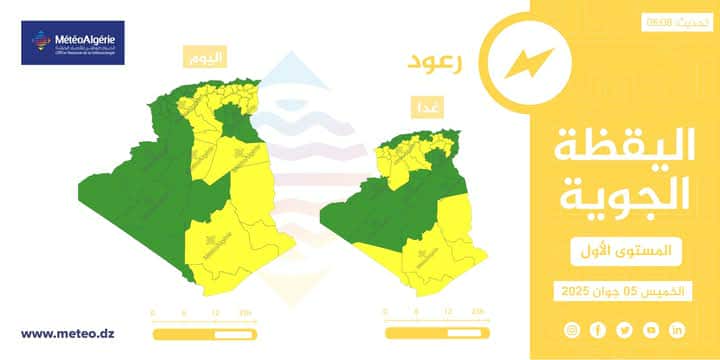 بينما امطار رعدية تشهدها كل من قالمة، سوق أهراس، تبسة، أم البواقي، خنشلة، قسنطينة، ميلة، باتنة، سطيف، برج بوعريريج، المدية، البويرة، المسيلة، الجلفة، تيارت، غرداية، المنيعة، ورقلة، إليزي، تمنراست، جانت، عين قزام.بينما تشهد مناطق -موجة حر غدا الجمعة، والولايات المعنيةالطارف، عنابة، سكيكدة، بجاية