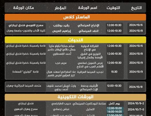 أما الورشات التكوينية تشمل التمثيل وصناعة البودكاست السينمائي والتقطيع التقني.