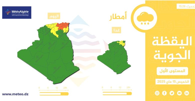 نبهت نشرية للديوان الوطني للأرصاد الجوية، من تساقط أمطار رعدية اليوم.