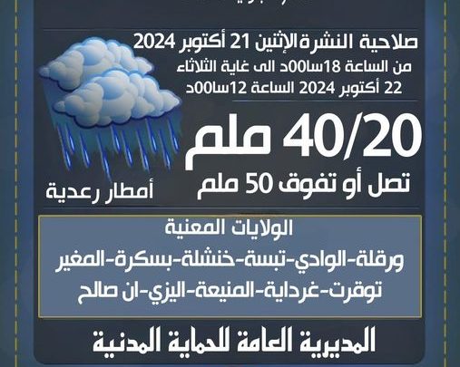 أوضحت نشرية الجوية الصادرة عن الديوان الوطني للأرصاد الجوية بتهاطل أمطار رعدية . كمية الأمطار المتوقعة بين 40/20ملم ، تصل 50ملم محليا ، ابتداءا من اليوم الإثنين من الساعة 18سا00د الى غاية يوم الثلاثاء على الساعة 12سا00د ۔