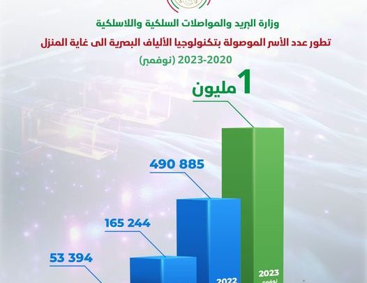 عرف عدد مشتركي تكنولوجيا الألياف البصرية FTTH” نموا وهدا بارتفاعه إلى واحد مليون مشترك بداية شهر نوفمبر 2023.