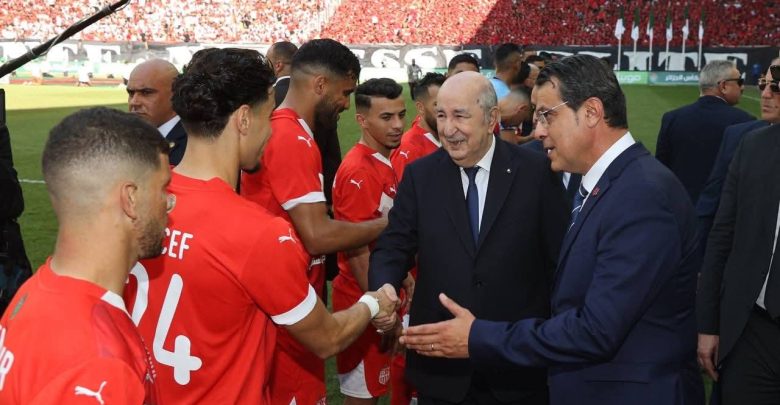 وفي أرضية الميدان لحظة وصوله، صافح رئيس الجمهورية السيد عبد المجيد تبون طاقم ولاعبي فريقي شباب بلوزداد واتحاد الجزائر.